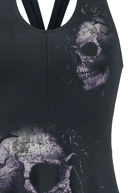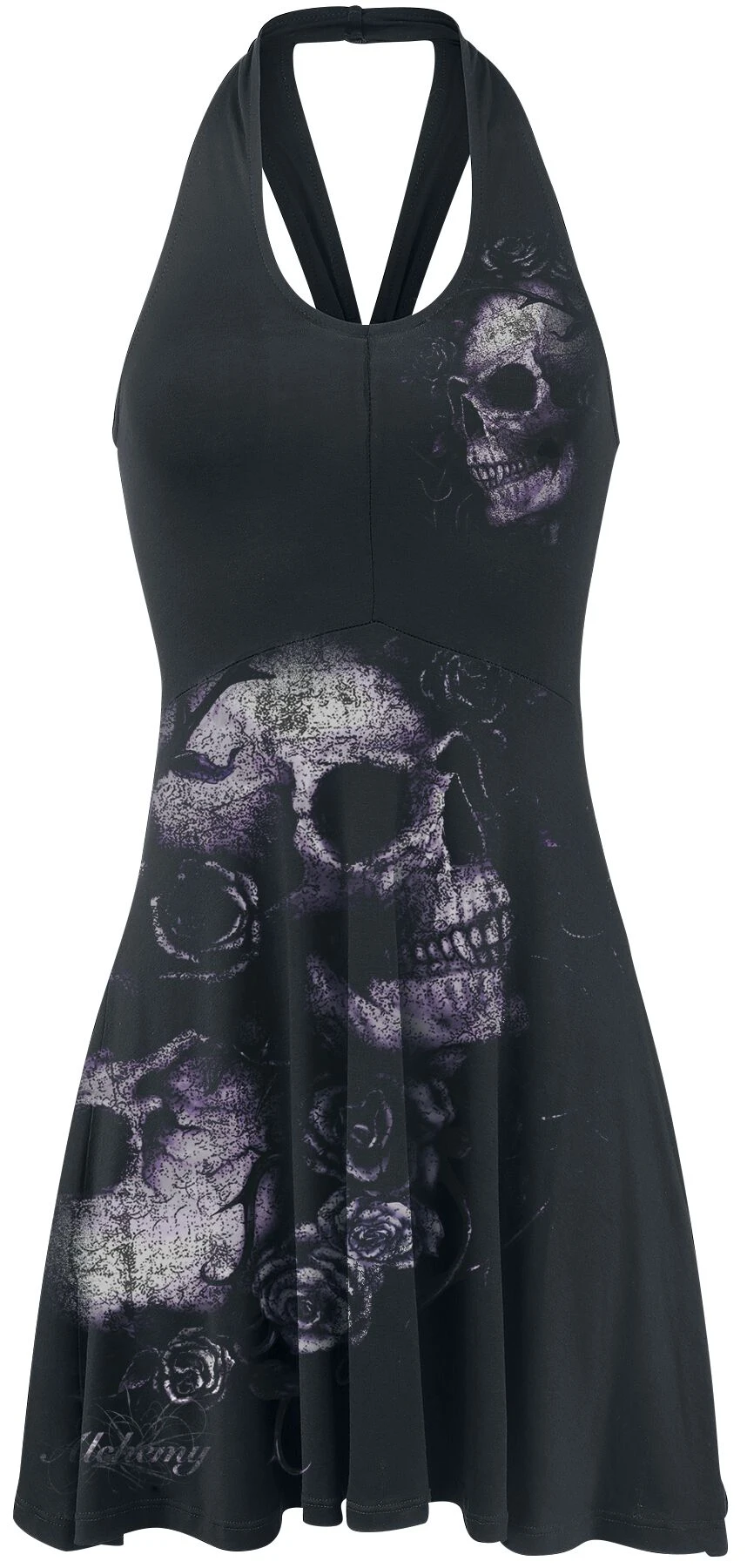 Die Herrschaften der Marke Alchemy England scheinen gute Beziehungen zum Teufel zu haben! Anders können wir den beeindruckenden Print auf dem locker geschnittenen Kleid nicht erklären. Das kurze Kleid Dead Flowers ist mit zwei Skulls bedruckt worden, aus deren Ohren dornige Rosen wachsen.