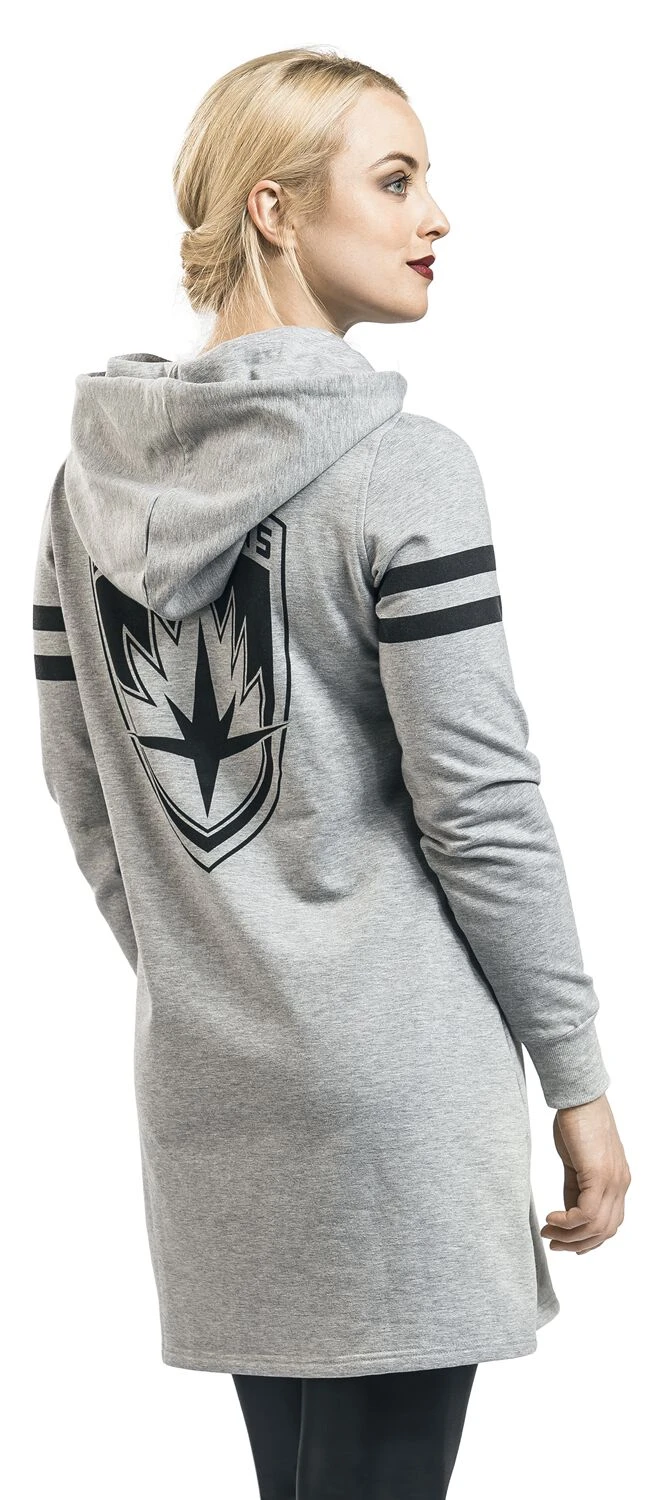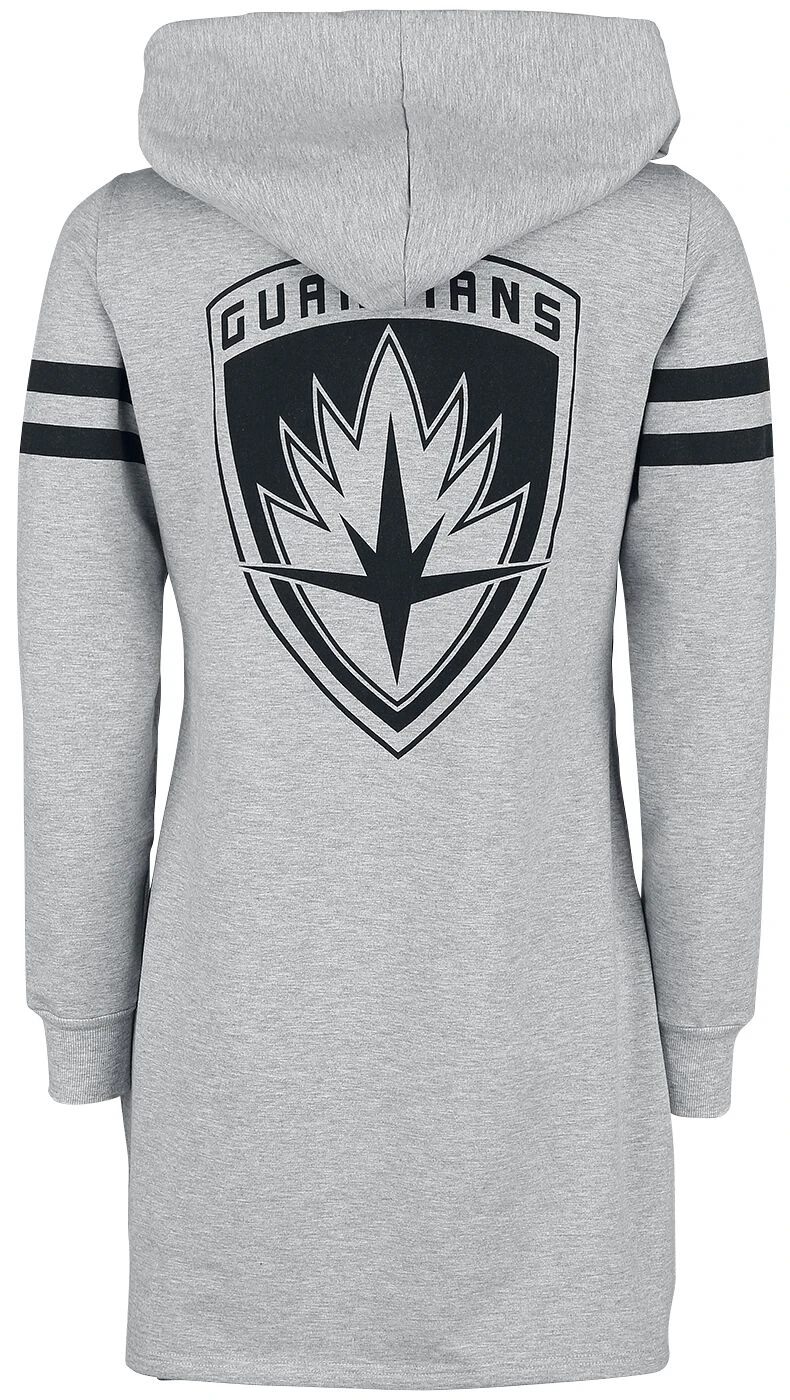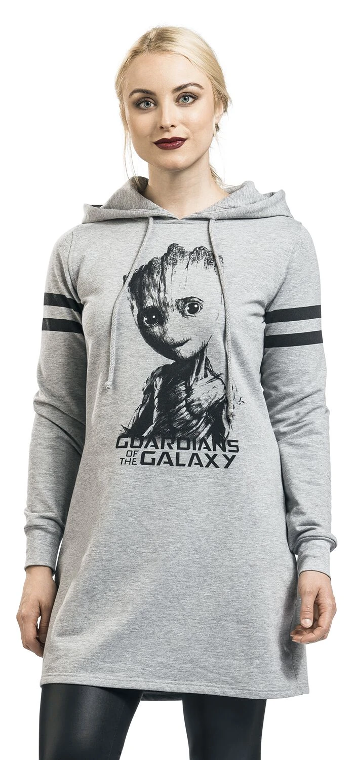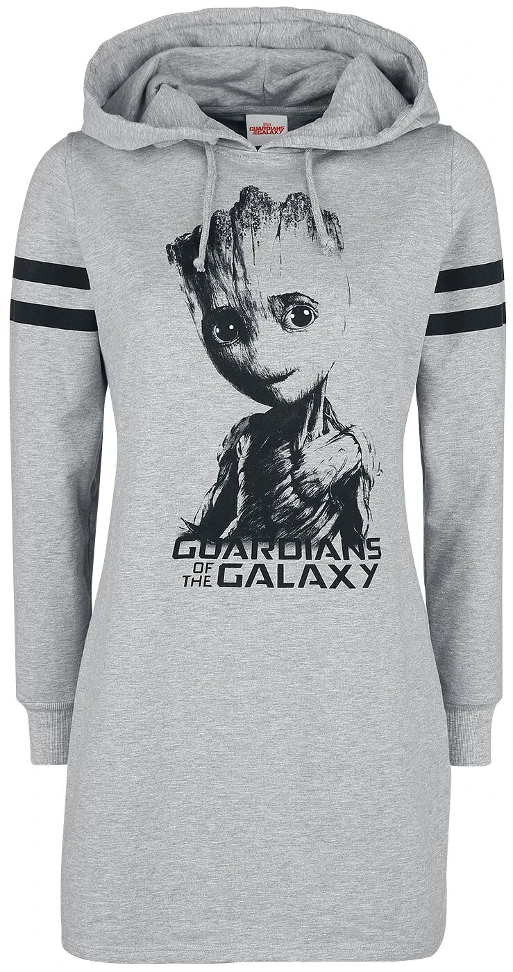 Exklusiv bei EMP: Bist Du ein Fan von Groot aus „Guardians Of The Galaxy“? Dann kannst Du das jetzt mit diesem mittellangen Kleid zum Ausdruck bringen. Das baumähnliche Wesen mit den übermenschlichen Kräften ist auf der Vorderseite mit dem Schriftzug des Films zu sehen. Auf der Rückseite sieht man das Guardians-Wappen. Das grau-melierte Kleid mit Kapuze und aufgedruckten Ärmelstreifen passt auch super zur Leggings.