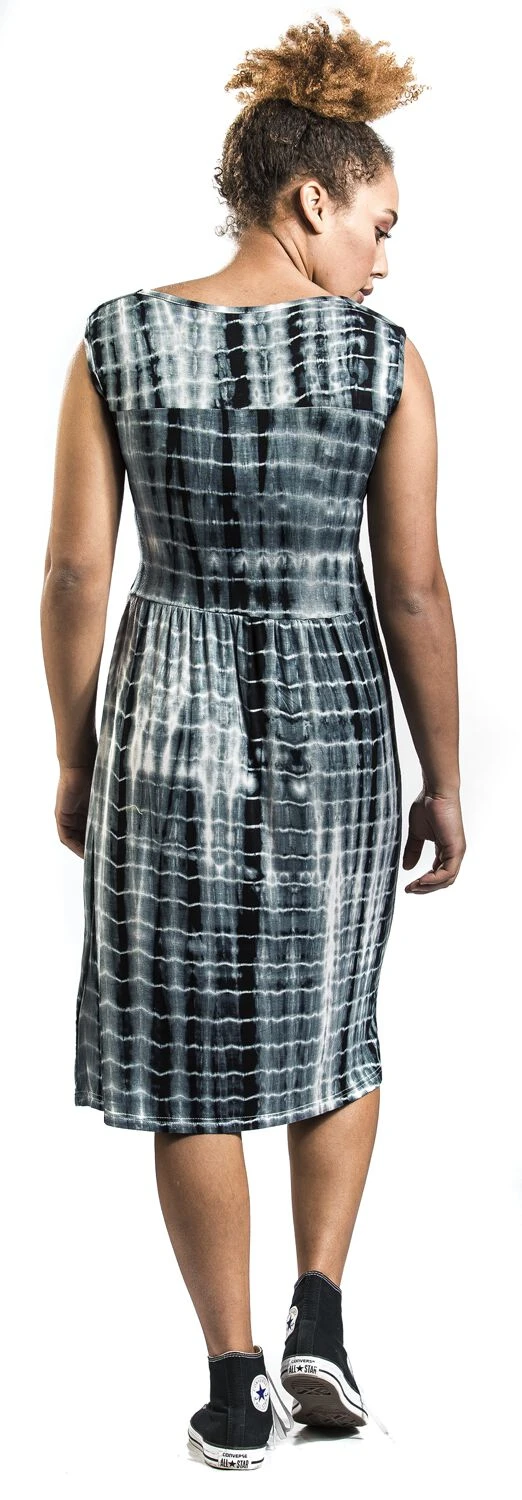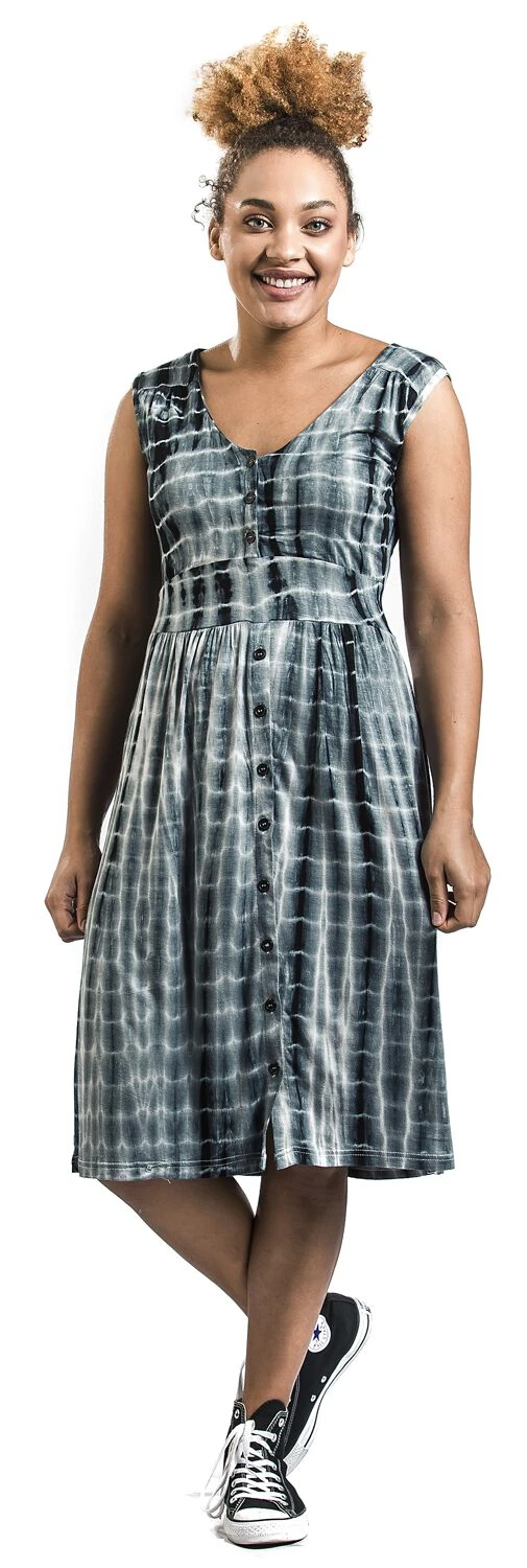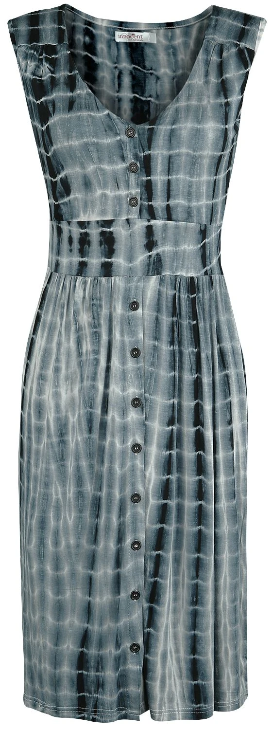 Wie ein Abend am See, in dem sich der Mond in den Wellen spiegelt: Das Muster auf dem „Luna Dress“ lädt Nachtschwärmer zum Träumen ein. Das mittellange Kleid von Innocent hat einen V-Ausschnitt, keine Ärmel und reicht bis kurz unters Knie. Die Knopfleiste auf der Vorderseite wird im Bereich der enger anliegenden Taille unterbrochen. Das mittellange Kleid besteht aus Viskose und wird mit der Hand gewaschen.
