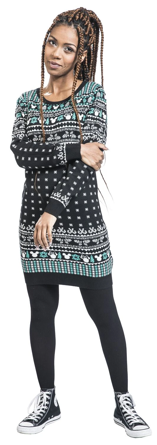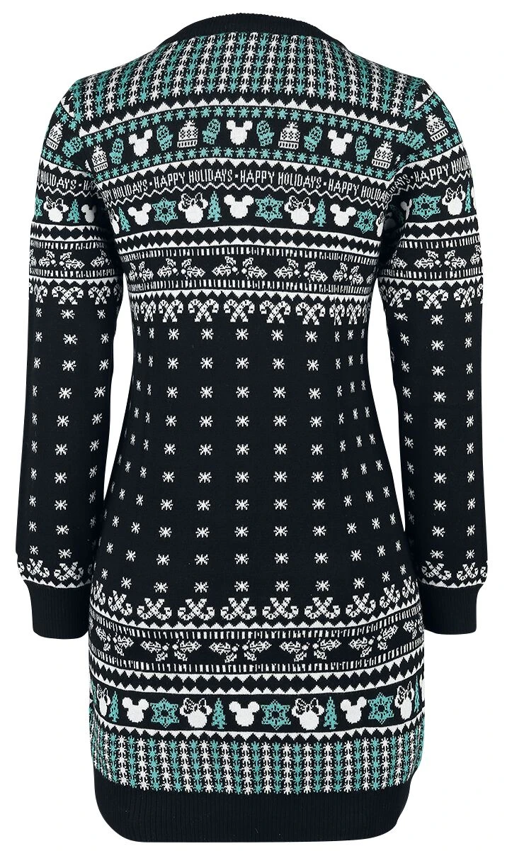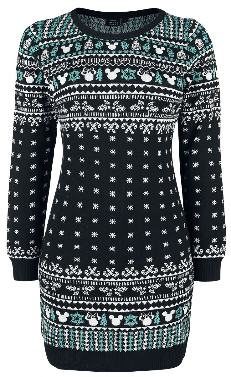 Öffne die Pforten deines Kleiderschranks, um das “Mickey & Minnie”-Kleid in verschiedenen Farben aufzunehmen. Das Kleid ist mit weihnachtlichen Motiven wie Zuckerstangen, Schneeflocken und Mistelzweigen bestickt. Es ist zudem mit praktischen Rippbündchen an den Ärmelenden und dem Kleidsaum ausgestattet. Sie erhöhen den Tragekomfort und sorgen für besseren Halt. Du kannst das Kleid mit deiner schwarzen Lieblingsleggings oder einer dicken, grünen Wollstrumpfhose perfekt kombinieren. Coole Boots oder feminine Stiefelette runden den Style optimal ab.