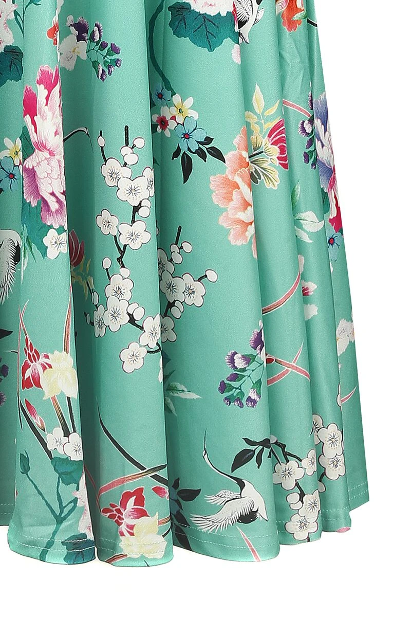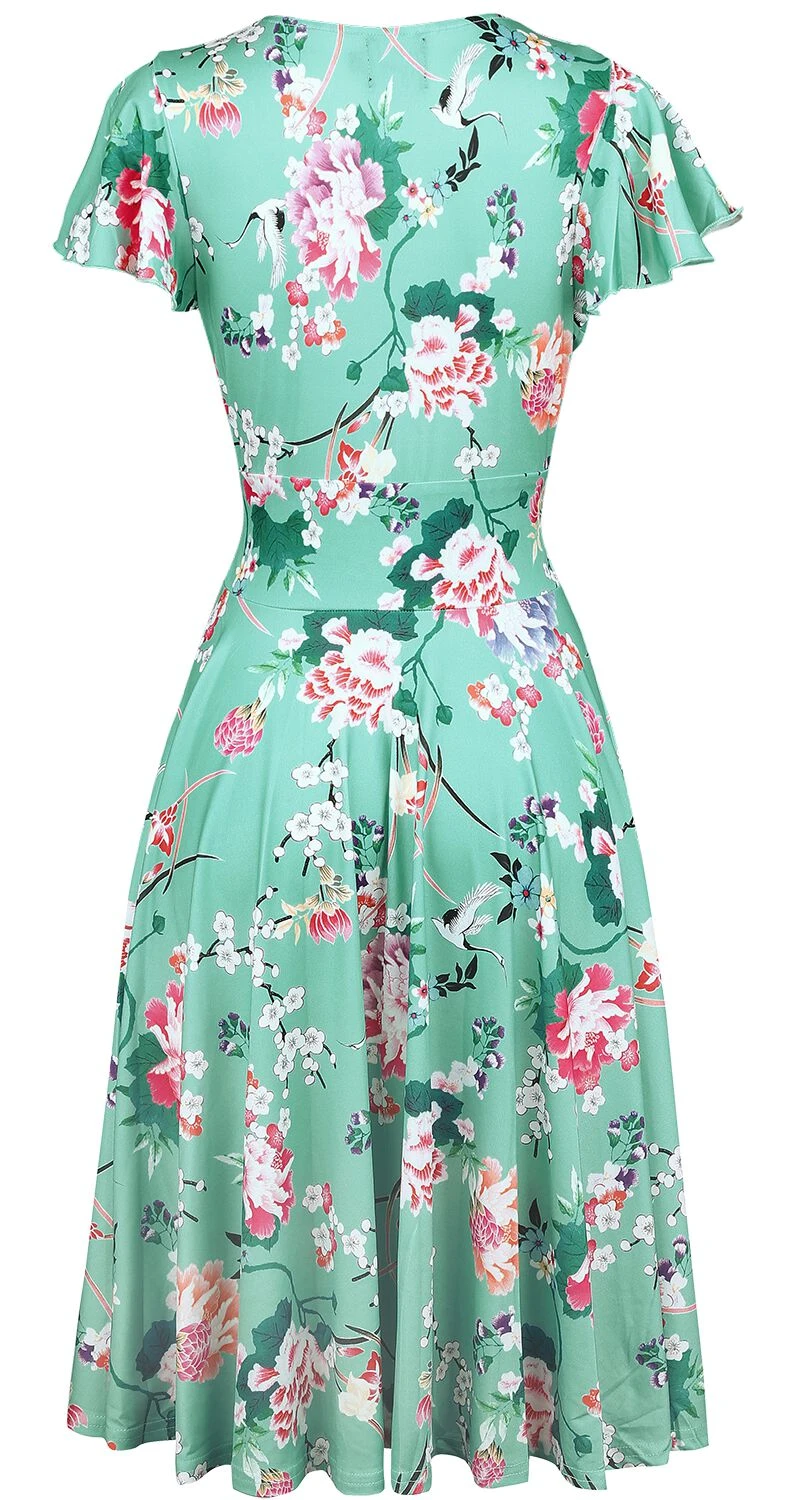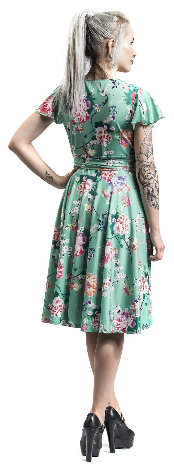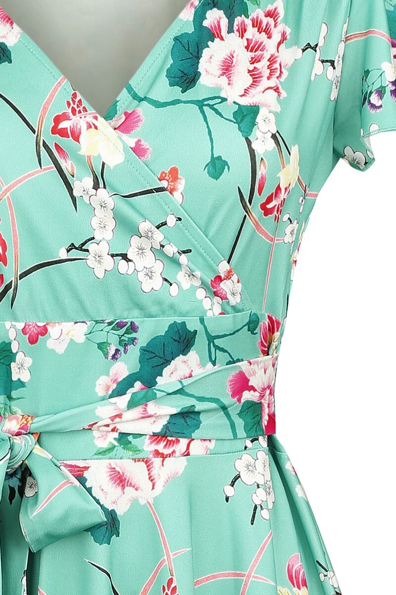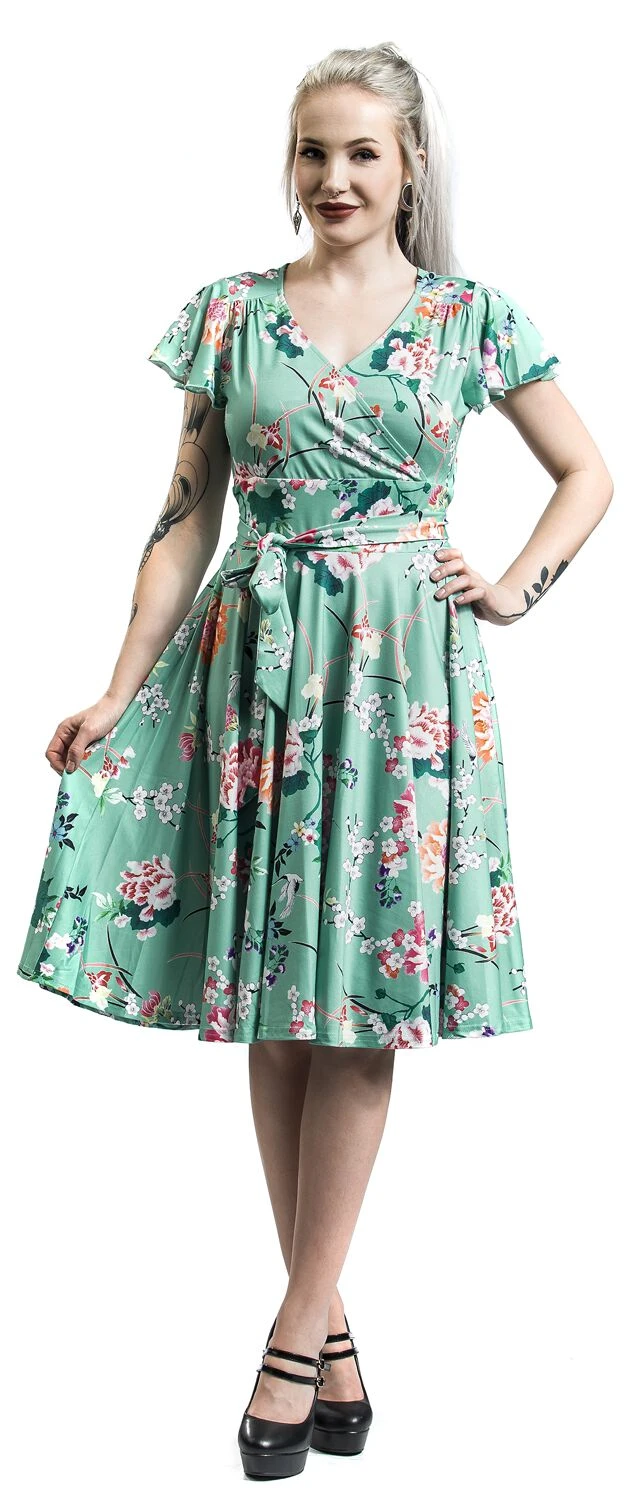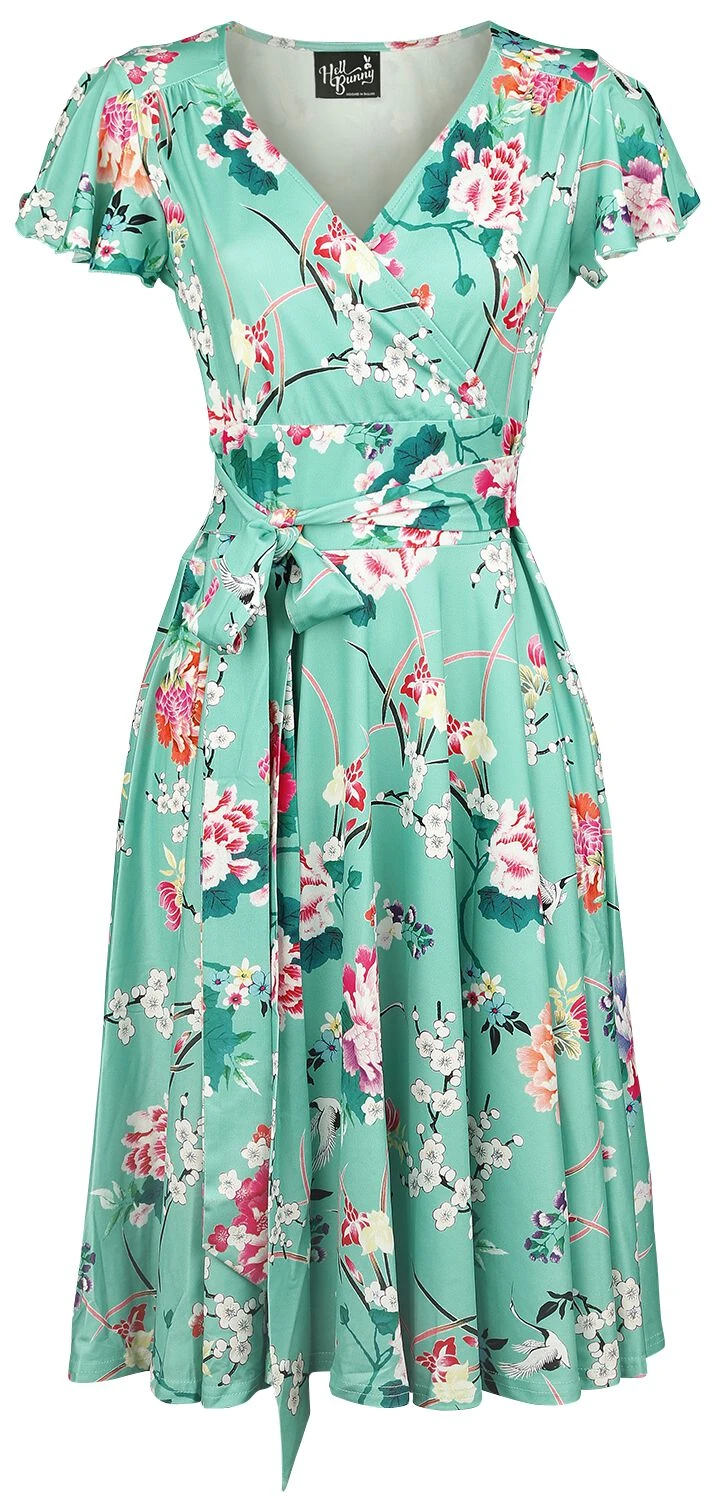 Mit dem „Midori Dress“ in kurzem Schnitt von Hell Bunny avancierst du zum attraktiven Blickfang, egal, wo du damit auftauchst. Das Kleid kommt ein einer wunderschönen Wickeloptik daher, weshalb es auch mit einem sexy V-Ausschnitt punktet. Kurze Ärmel sind an den Enden mit kleinen Rüschen versehen. Hingucker ist in jedem Fall der florale Alloverprint, welcher auf dem mintfarbenen Grundton so auffällige zur Geltung kommt. Dank des weichen und angenehmen Stoffes überzeugt das Kleid auch mit bequemem Tragekomfort.