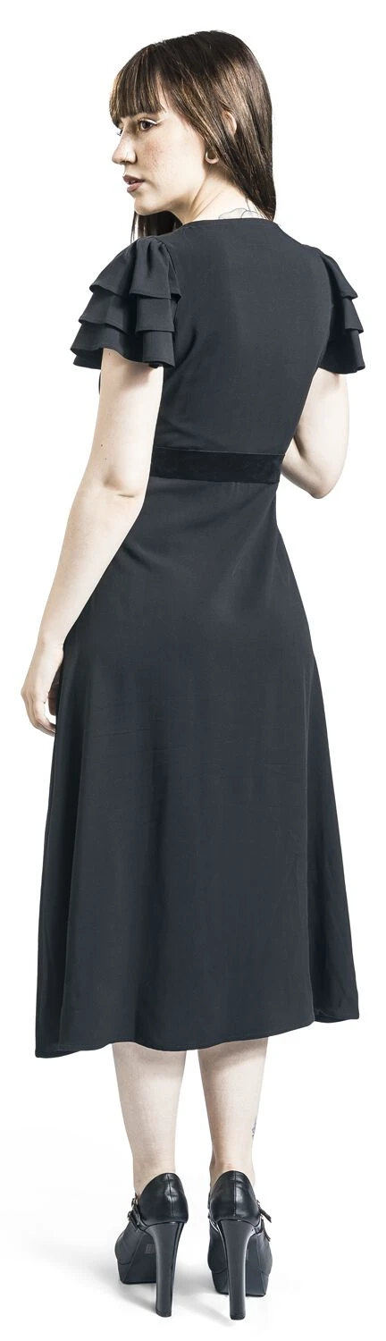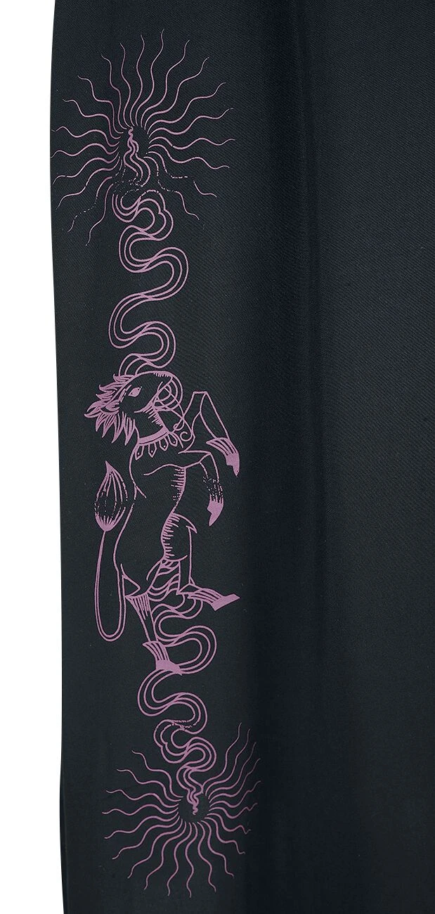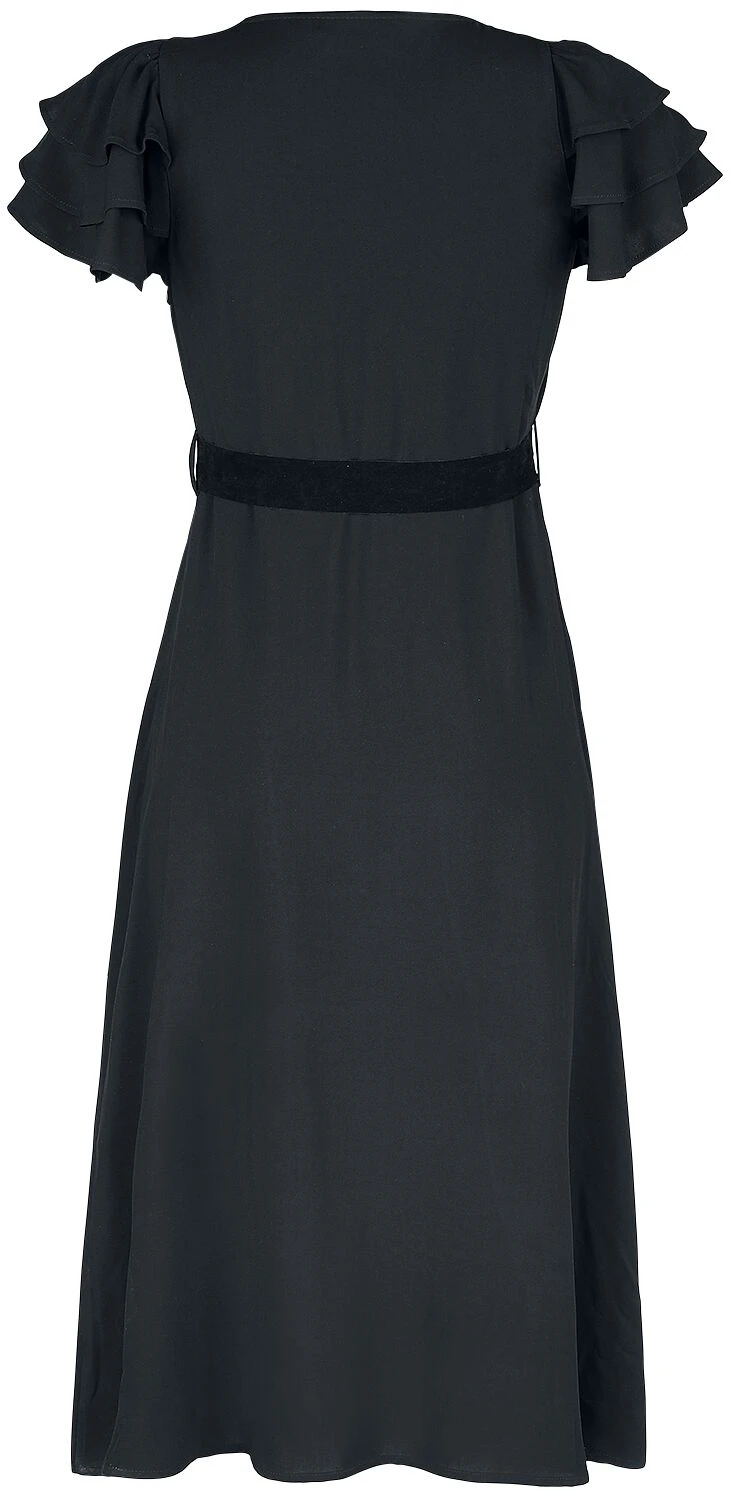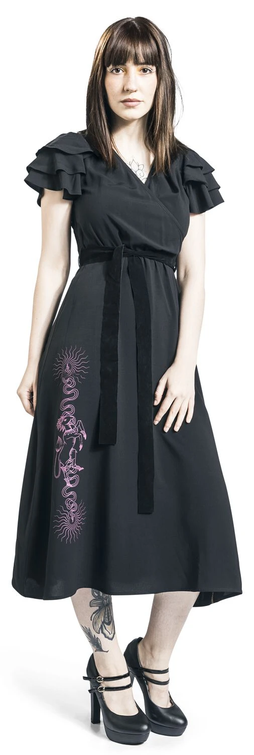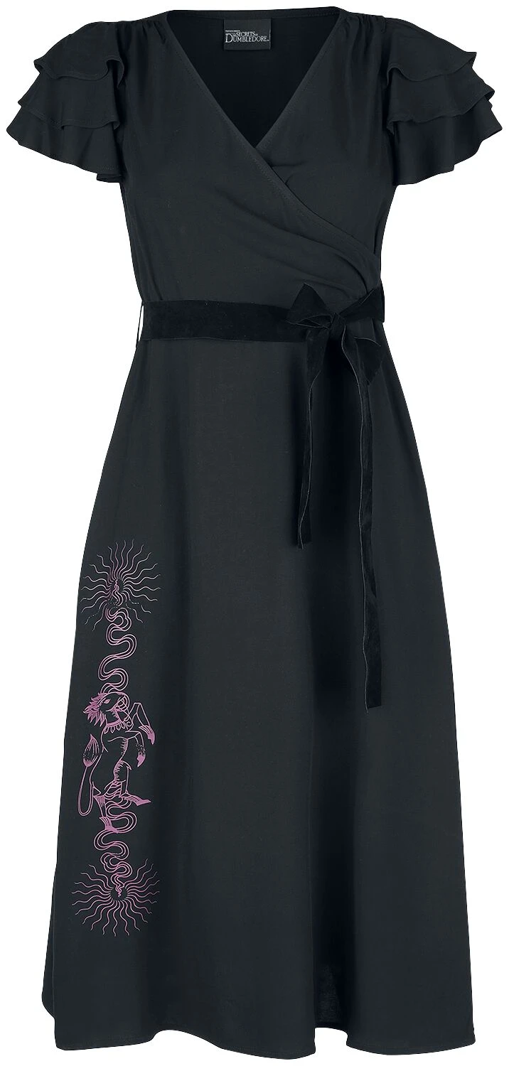 Exklusiv bei EMP kannst du dich passend zu deinen Film-Highlights einkleiden, beispielsweise mit dem „Queenie“-Kleid zum Blockbuster „Phantastische Tierwesen 3“. Das Kleid ist im mittellangen Schnitt gehalten, weshalb du es zu vielen Anlässen tragen kannst. Es besteht aus einer weich fließenden Viskose-Web-Ware und hat wunderschöne Volantärmel. Ein überlappender Ausschnitt setzt dich attraktiv in Szene. Ein Samtgürtel auf Taillenhöhe betont die schmalste Stelle deines Körpers und sorgt für eine sexy Silhouette. Der Druck auf dem Rockteil rundet den Style perfekt ab.