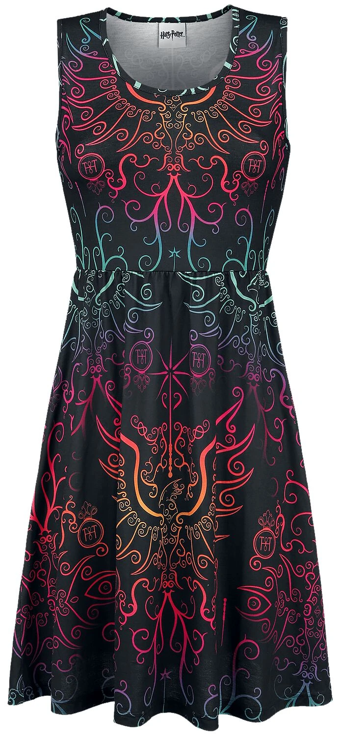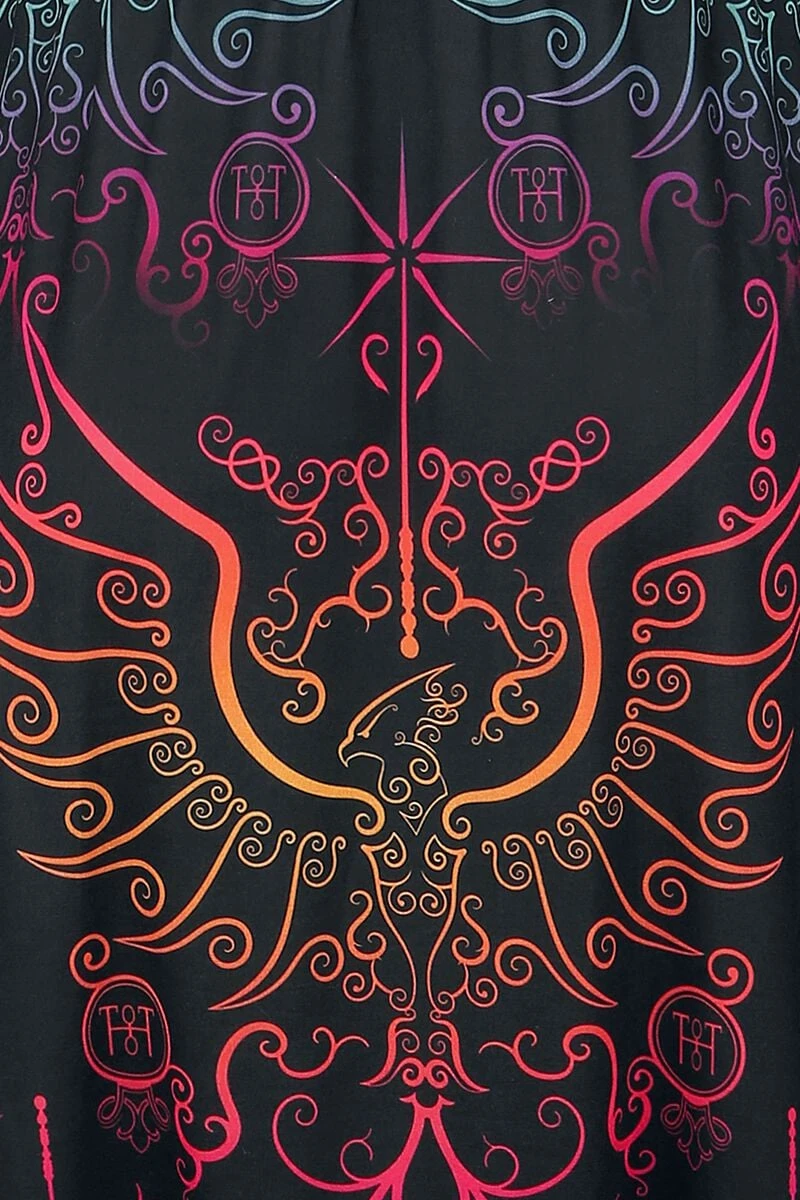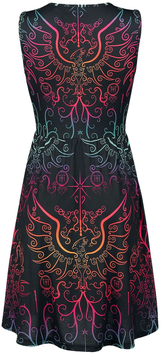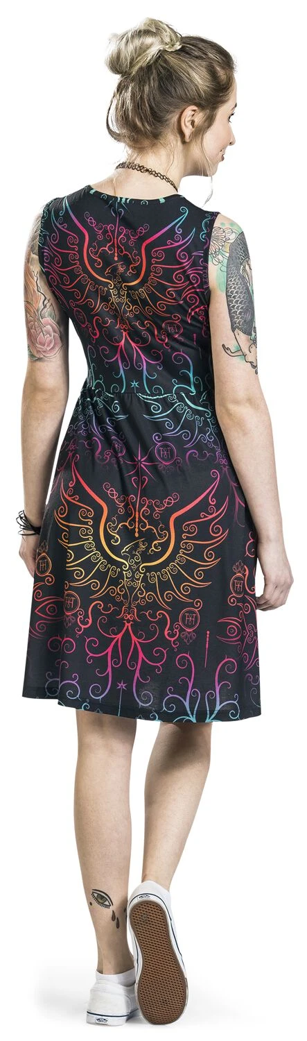 Exklusiv bei EMP: Ein Phönix ist ein magischer Vogel, dessen Federn wie Flammen leuchten. Fans von Harry Potter kennen den Feuervogel, der für die Wiedergeburt steht. Der Patronus von Dumbledore ist ein Phönix. So bekam der Orden des Phönix seinen Namen. Mit diesem mittellangen Kleid kannst Du das magische Tier ehren. Das Kleid „Phönix“ ist komplett bedruckt, tailliert geschnitten und besteht aus Viskose.