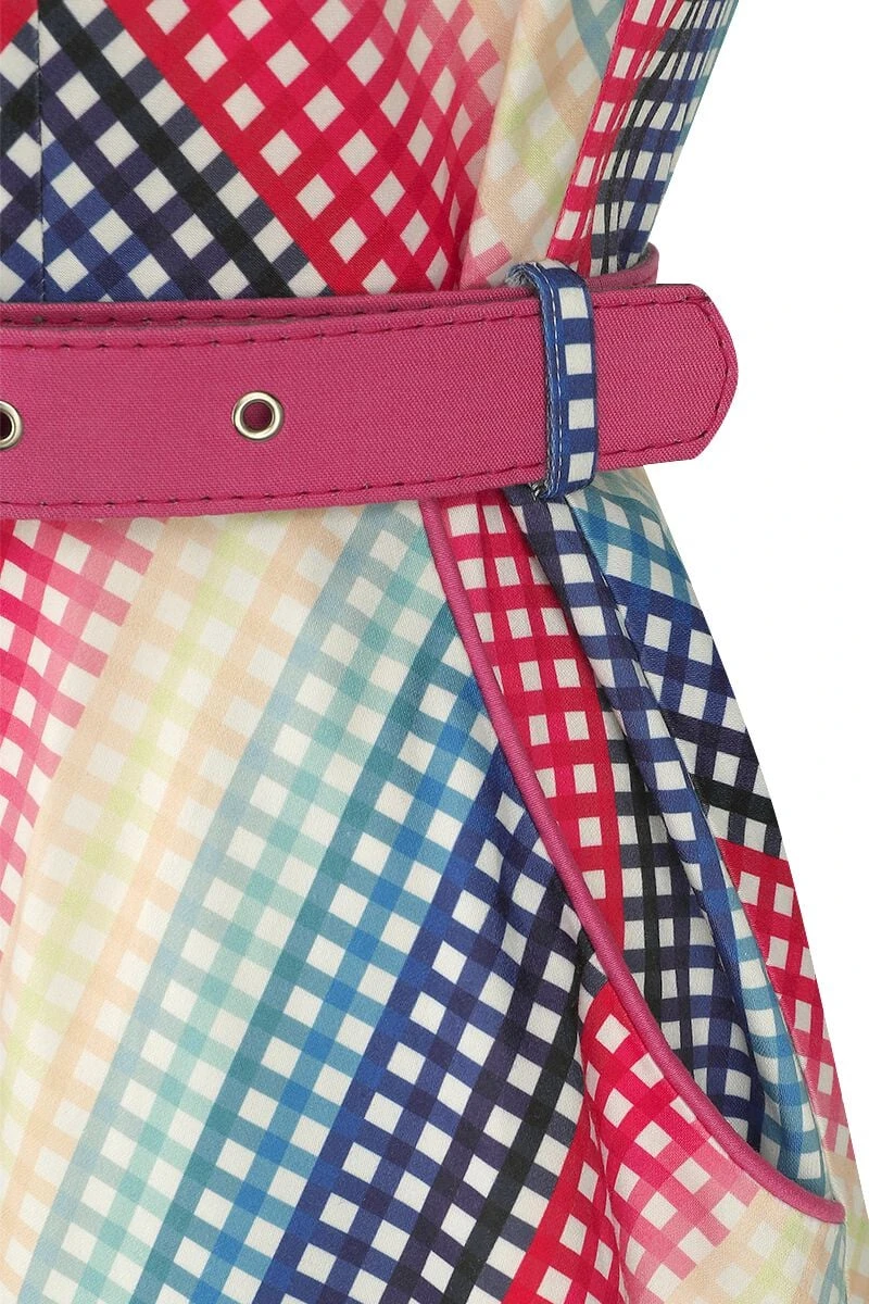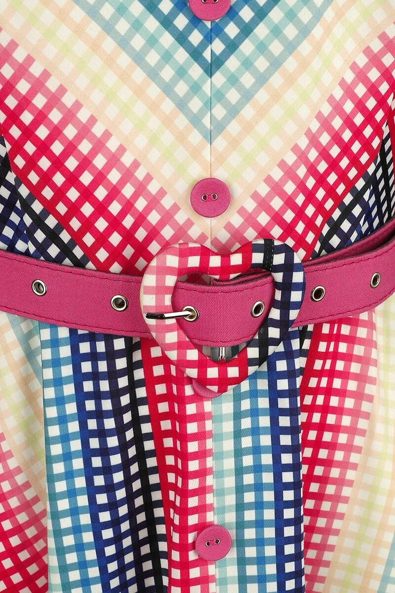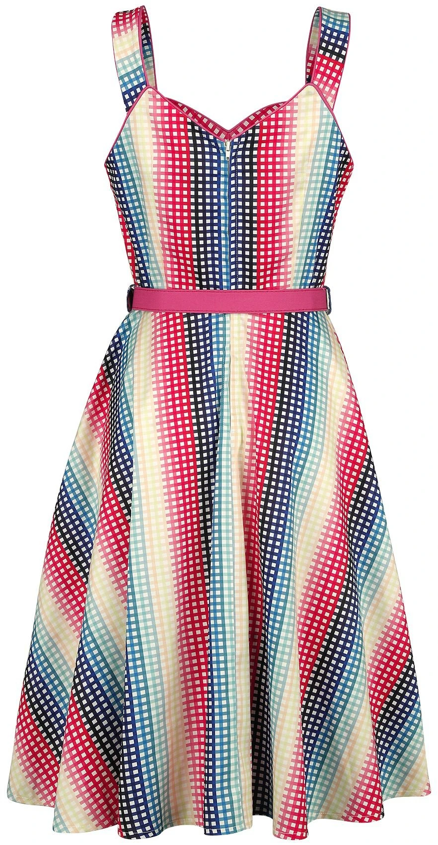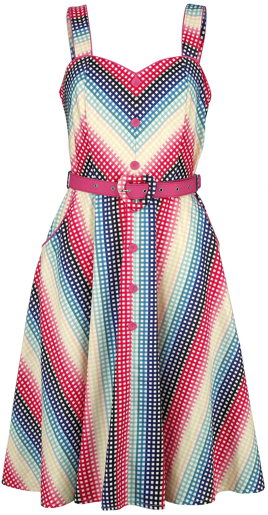 Mach dir mal wieder selbst eine farbenfrohe Freude mit dem süßen „Serene Rainbow Gingham Flare Dress“ im mittellangen Schnitt von Voodoo Vixen. Nicht nur die bunten Regenbogenfarben machen es zu einem Hingucker. Auch der verführerische Herzausschnitt sorgt für einen femininen Blickfang. Eine Zierknopfleiste schmückt die Front, genauso wie der Gürtel mit Herzchen Schnalle im gleichen farblichen Style wie das Kleid. Seitliche Einschubtaschen bieten Platz für Kleinigkeiten und schenken dem Look einen lässigen Akzent. Das leichte und sommerliche Material überzeugt mit einem hohen Tragekomfort. Dank des leicht schwingenden Rocks wird deine Silhouette umspielt, während das Oberteil enger anliegt. Die etwas breiteren Träger unterstreichen den sommerlichen Stil des Kleides. Hinten ist ein Reißverschluss gearbeitet, damit du es einfach an- und wieder ausziehen kannst.