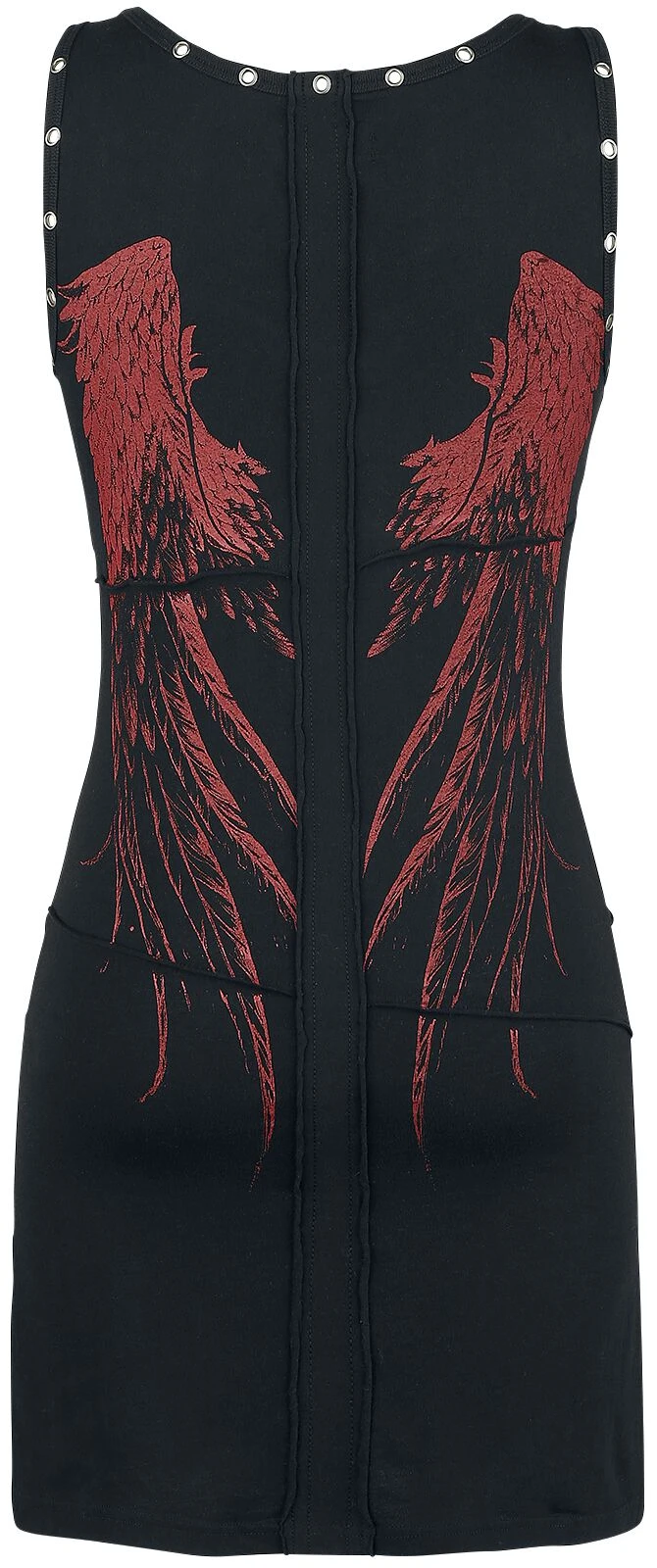 Auf dem schwarzen Stay A Little Longer Kleid von Rock Rebel by EMP sind verschiedene Applikationen mit Prints aufgenäht. Auf der Vorderseite sind passende Rock Rebel Sprüche aufgedruckt und auf dem Rücken prangen großflächig rote Flügel. Am Hals und an den Schultern sind Zierösen eingearbeitet.