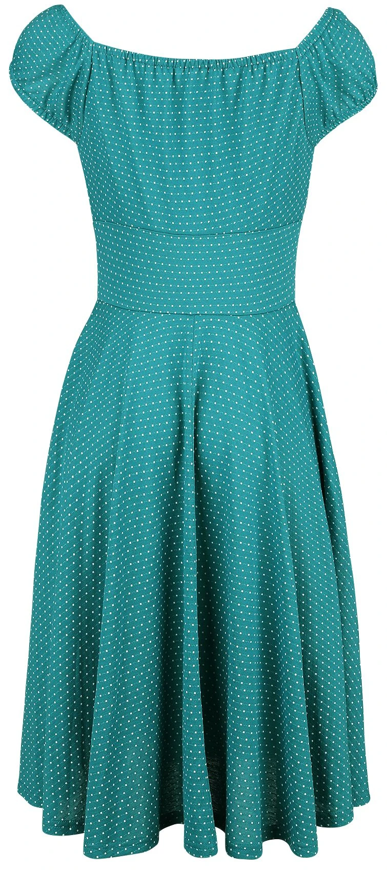 Das „Teesy Green Gathered Dress“ im mittellangen Schnitt von Voodoo Vixen ist schon allein aufgrund der Farbgebung ein auffälliger Blickfang. In einem leuchtenden Petrol kommt es modern zur Geltung und wird zudem von einem kleinen weißen Punkte-Muster kontrastiert. Der Ausschnitt wird von einer süßen Zierschleife verspielt in Szene gesetzt wird. Dadurch kommt der Carmen-Ausschnitt zusätzlich zur Geltung. Damit es optimal sitzt, ist es am Dekolleté und an den Ärmeln mit einem elastischen Gummibund gearbeitet. Das weiche, elastische Material sorgt für einen hohen Tragekomfort.
